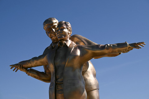 Diberi judul "the King of the World" patung ini menampilkan figur Trump dan Epstein dalam pose mesra seperti dalam adegan film Titanic yang diperankan oleh Jack dan Rose saat berada di haluan kapal.
